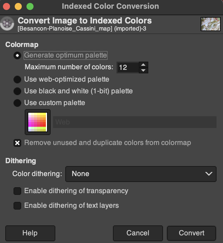 There are at least two ways to generate a color palette from the Cassini map of Besacon: Image Color Summarizer and GIMP.